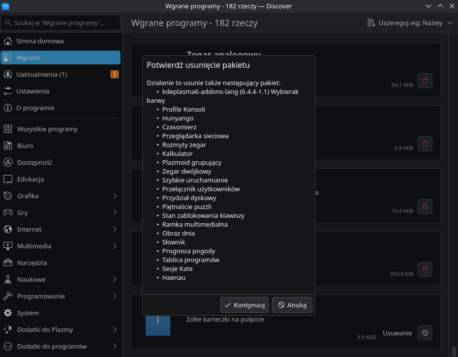 Pierwsze, co rzuciło mi się w oczy, to dziwny sposób odinstalowywania pakietów graficznie. W Discover czy w Yast2 filtrowanie pakietów „zainstalowanych” działa, ale… zaznaczenie domyślne aktualizuje, zamiast usuwać. Trzeba się więc trochę przeklikać, żeby osiągnąć efekt.